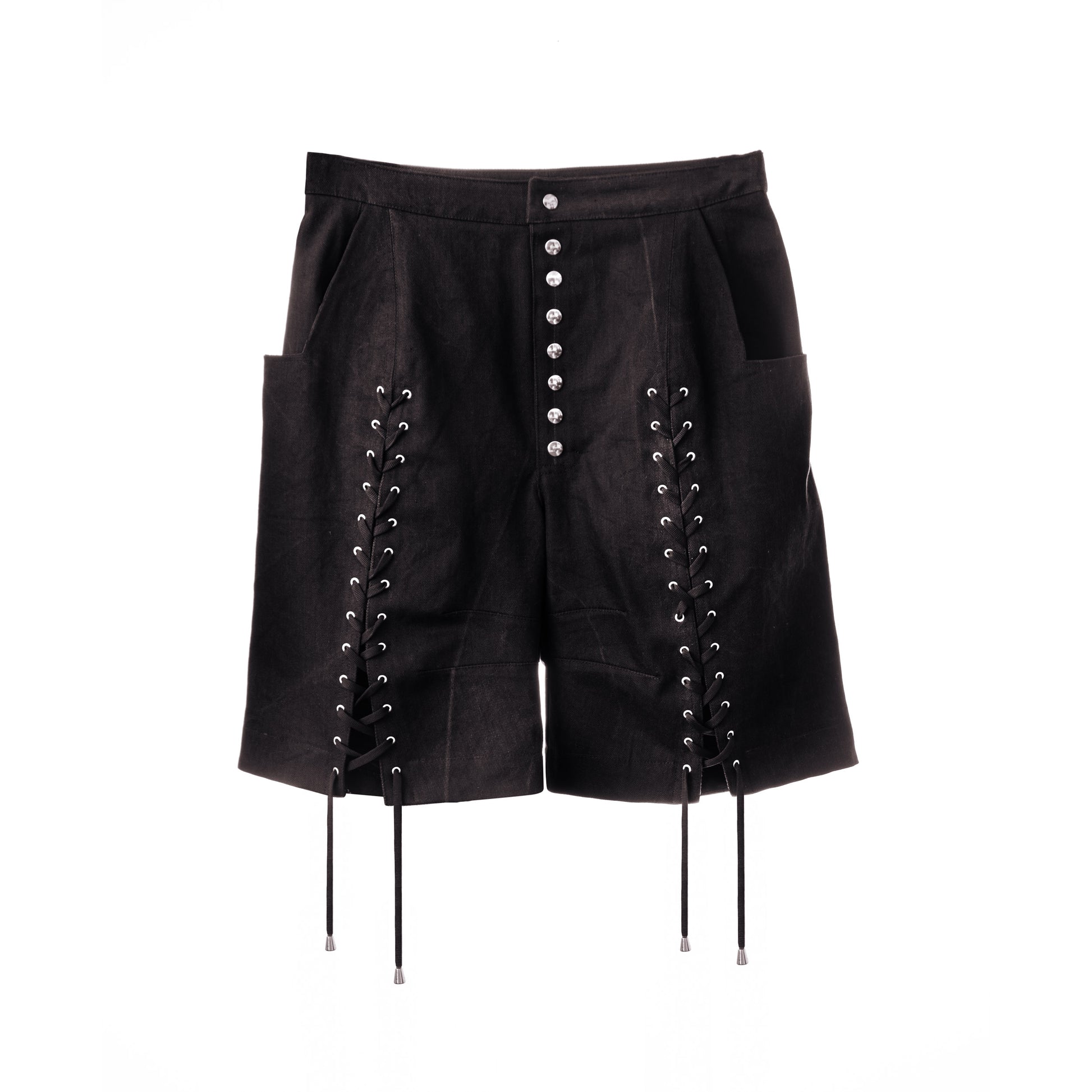 These knee-length cargo shorts are crafted from black cotton denim. The shape and volume are defined by a series of darts, creating a structured look. They feature voluminous side pockets on the front and applied pockets on the back. The front is finished with a corset-like opening, laced up with cotton strings and steel ends.