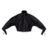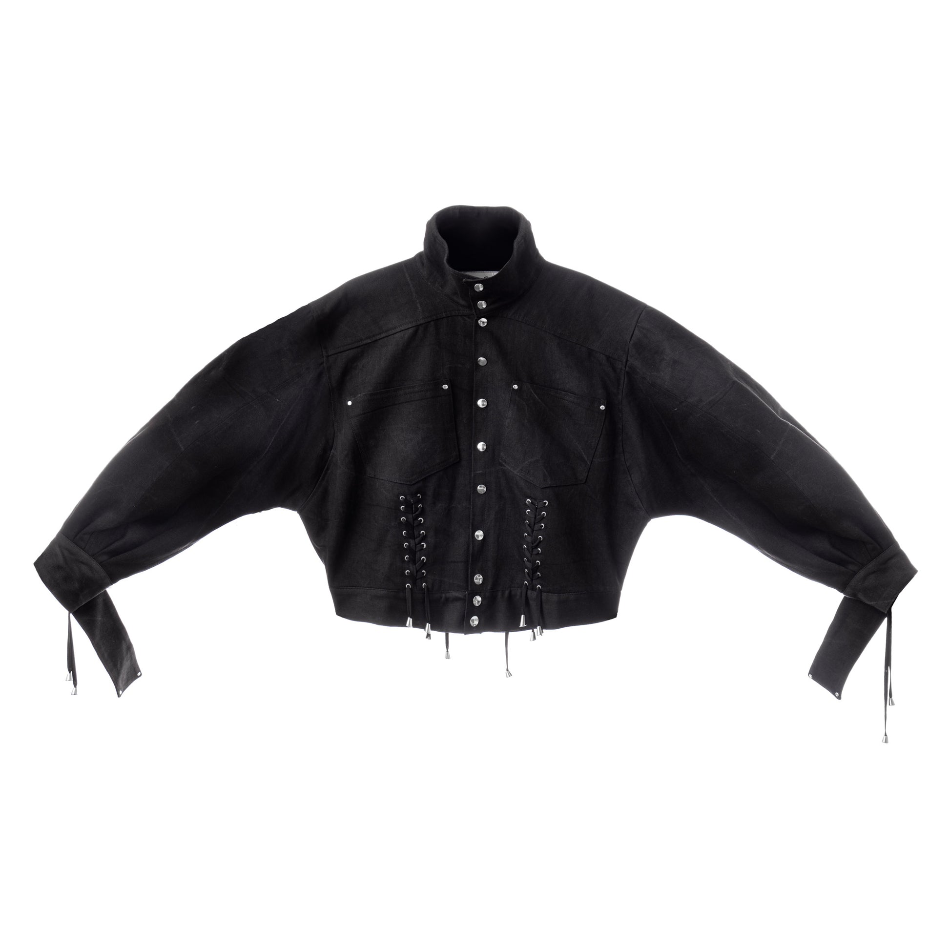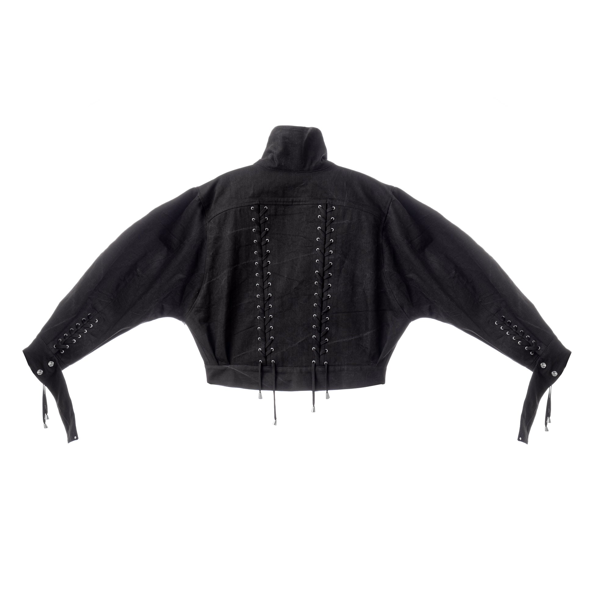 This bomber-style jacket is made from plain black cotton denim with nickel-free steel snap buttons on the front. It features a high collar that can be worn up or down and has two front pockets. The jacket is adorned with decorative corset-inspired lacing on the front, wrists, and back, using cotton strings with steel ends. Extra-long cuffs complete the design for a distinctive look.