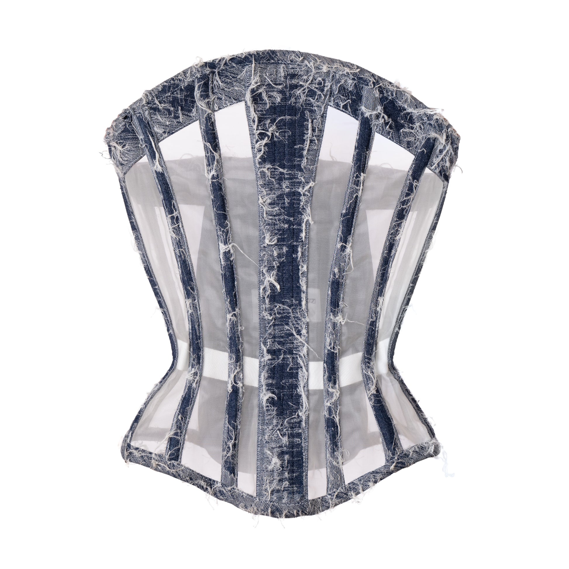 This design is made with a semi-transparent nylon mesh with hand-scratched 100% cotton "Scratch & Jean" ISKO™ denim boning channels and edge bindings and it's boned with both flat steel and spiral steel boning.